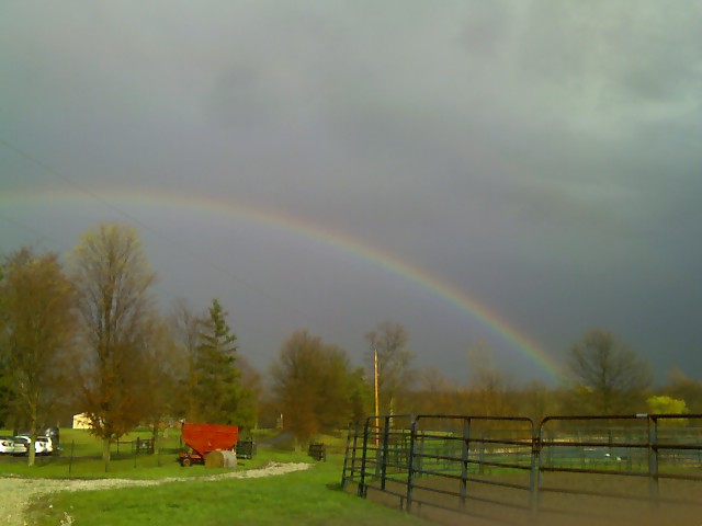 I spent all afternoon teaching riding lessons in an indoor arena, and when I walked out there was a brilliant full rainbow contrasted against dark clouds. The picture was taken from my phone, so its poor quality, but the sight was breathtaking.