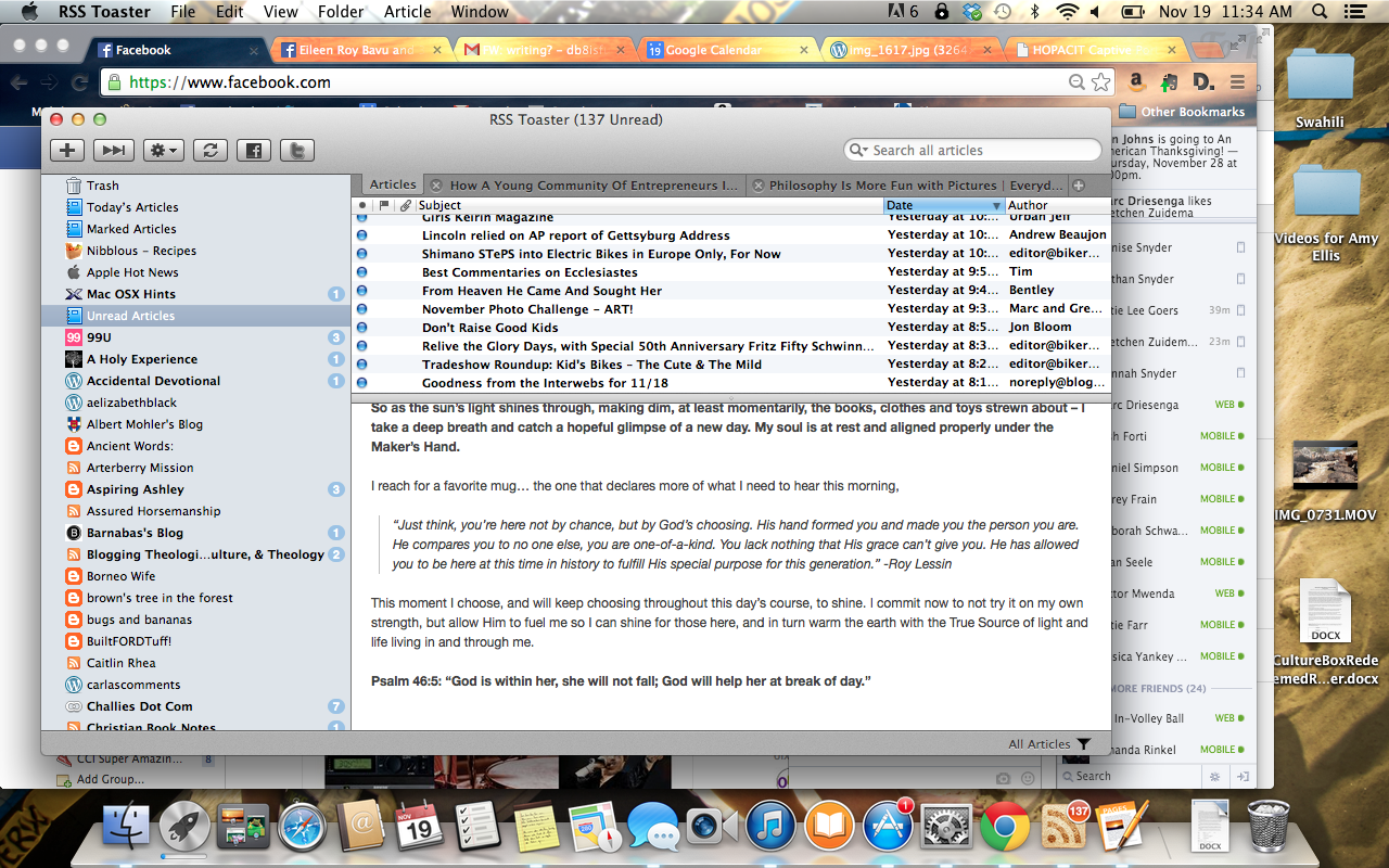 I just have to say, I love Apple products. After using the Dell laptop provided by HOPAC, having my own MacBook Pro at school, even just for one day, makes my life so much easier. But that’s not why I posted this screenshot. See that RSS Reader? Its full of (unread) posts from various blogs that I subscribe to. I don’t read everything, but I enjoy reading friends’ personal blog posts, as well as posts from organizations like Desiring God, Together for Adoption, (in)courage, and others.