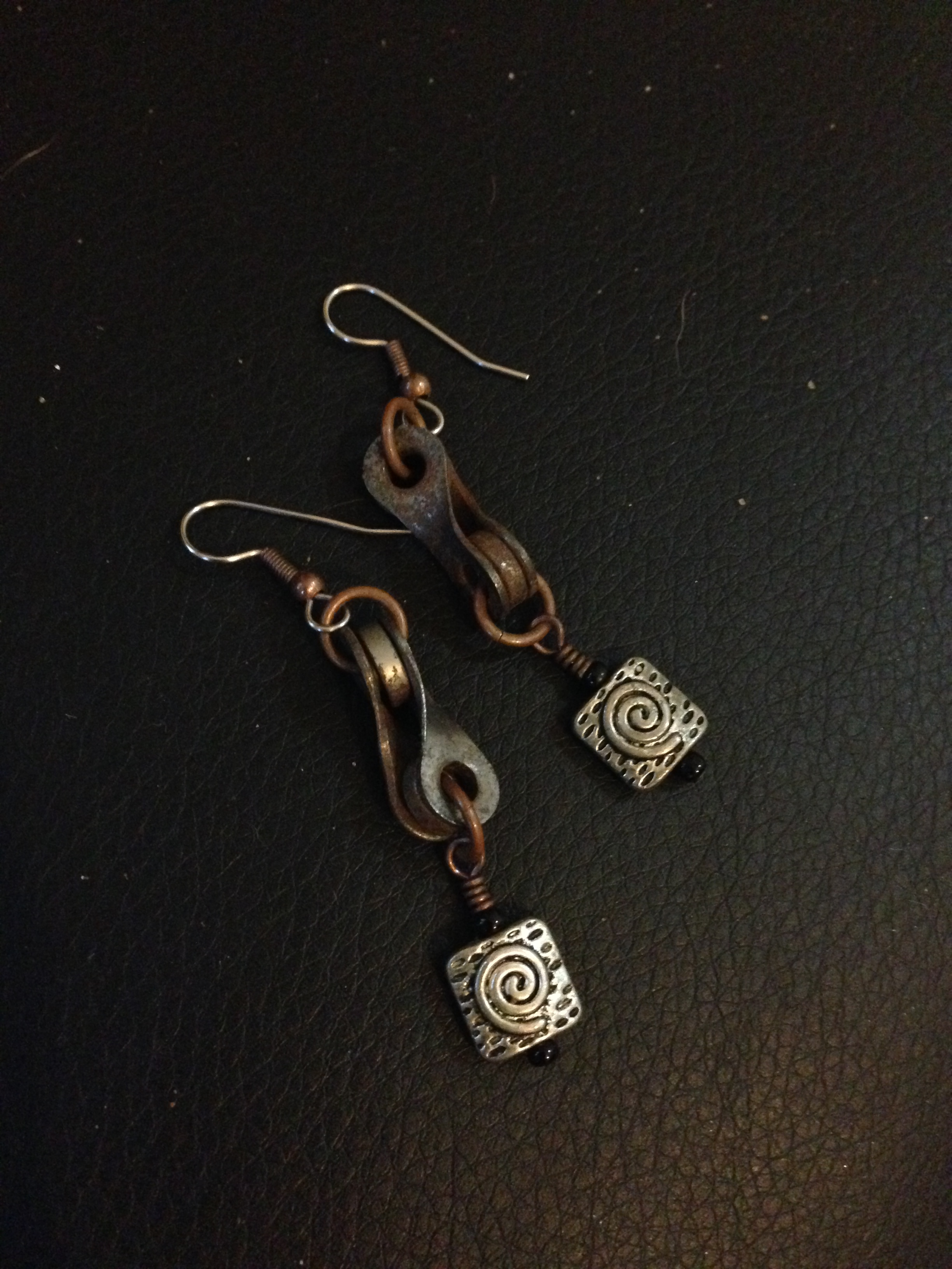 Another pair of bicycle earrings!!! These are made from repurposed bicycle chain links, and are just so much fun to wear! If I remember correctly, they were handmade in Colorado, though I purchased them online. I chose them for today to match my TwinSix cycling t-shirt… and the fact that I rode my bicycle to work this morning!