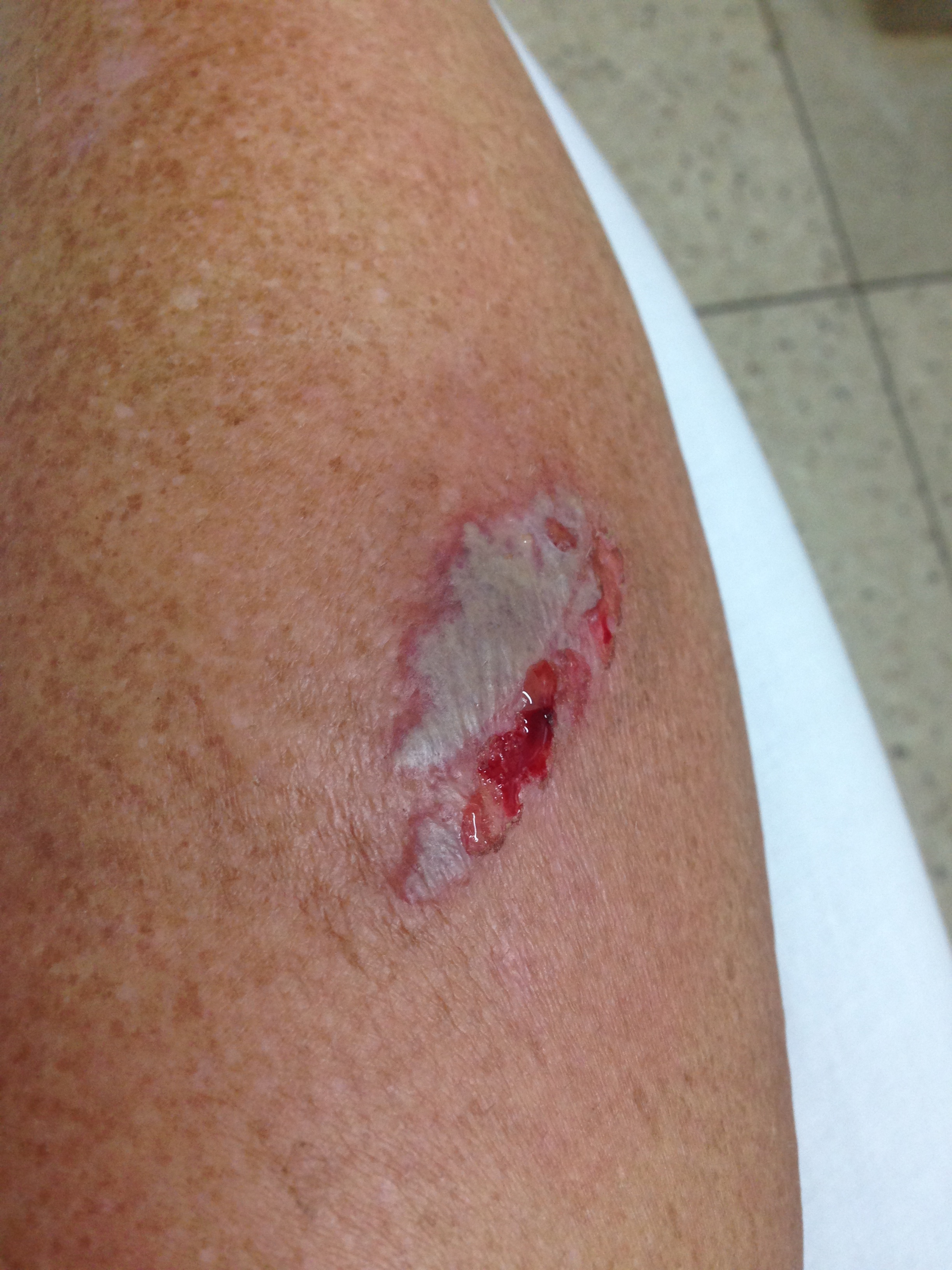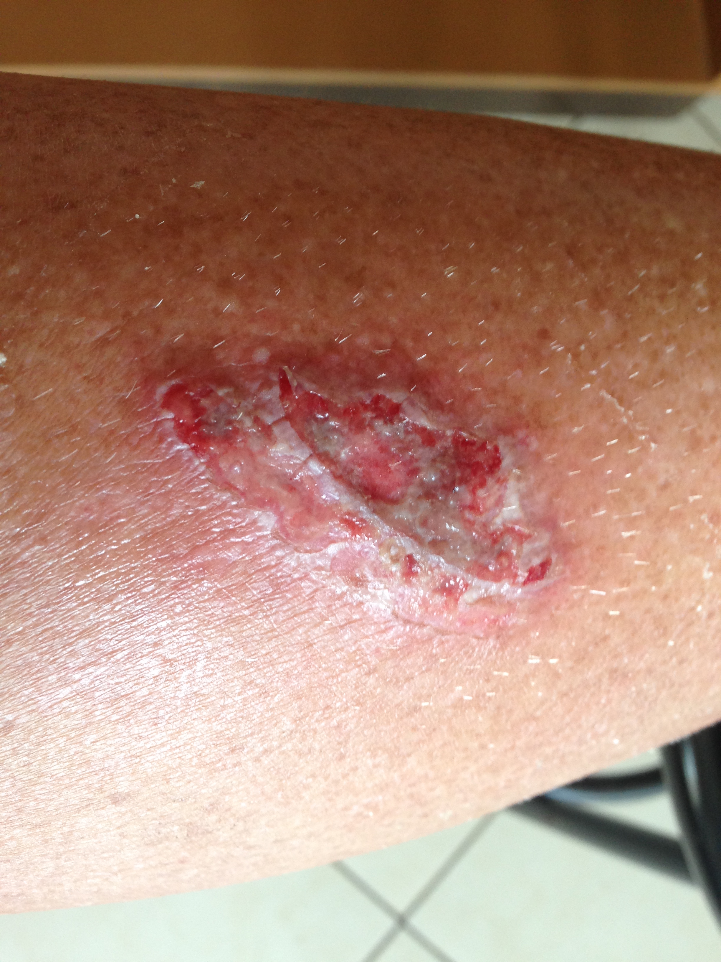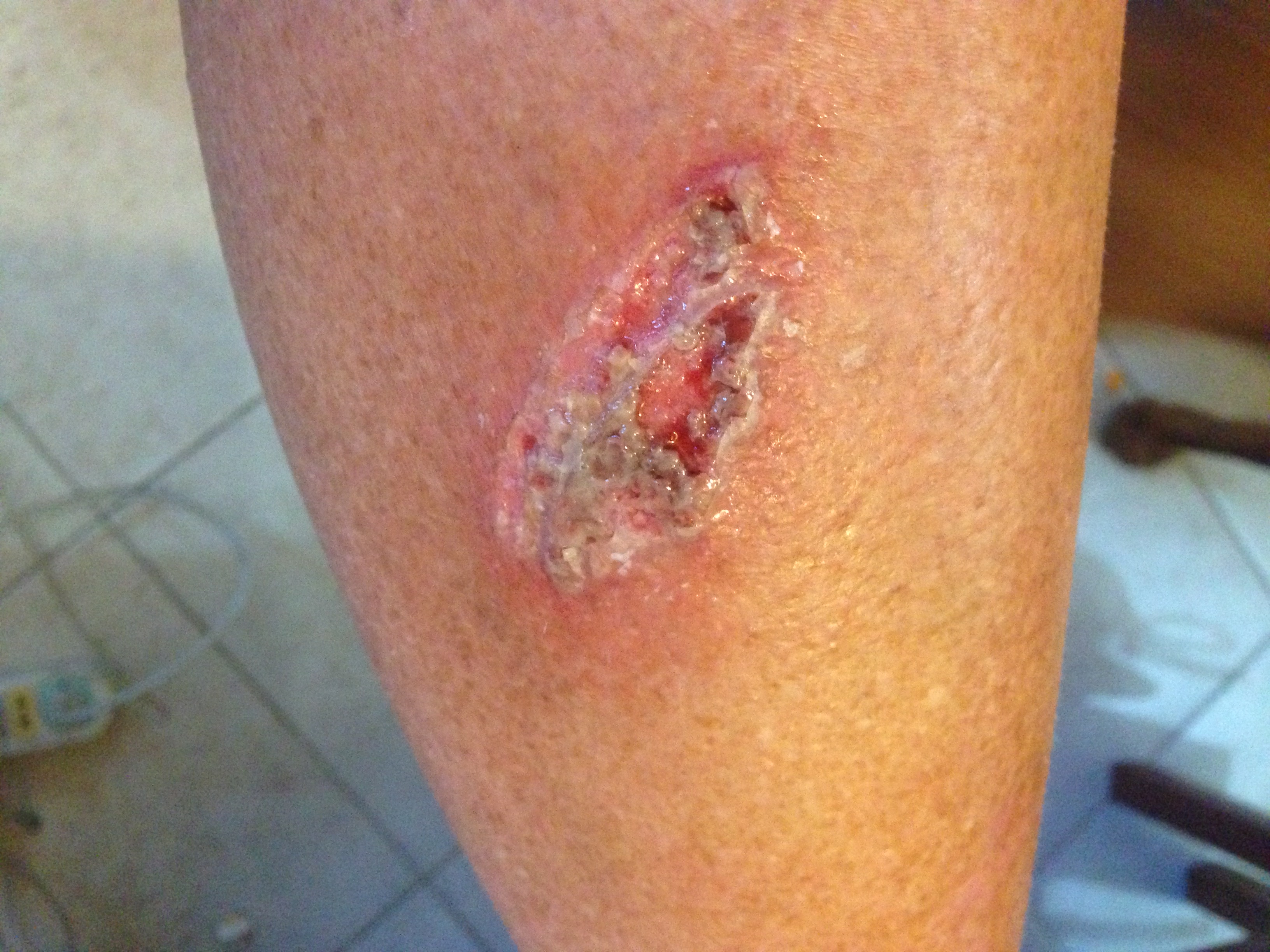 I cleaned the burn after Frisbee and then forgot about it. Wednesday and Thursday passed, and it was healing fine–just a small open scrape on my shin. No big deal.