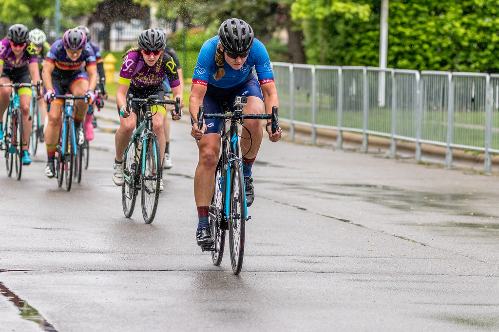 The Fat & Skinny crit is my only crit this season, and my goal was simple: don’t wreck. I was also hoping for top ten, but, after considering my options with my coach earlier in the week, was not overly hopeful. Some good teams tend to attend this particular race and as a solo rider with no sprint (thanks to training exclusively for endurance events this year), it is hard to get a win. This year was wet, with showers off and on and a strong headwind on the back stretch, that reminded me of my acute disadvantage as a tall rider in a peloton of tiny females. I warmed up halfheartedly (trying to stay as dry and warm as possible), then lined up and waited for the chaos.