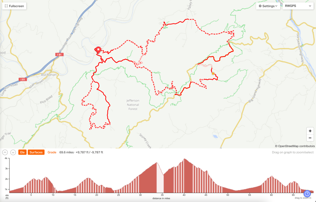 After a few iterations, I arrived at the “Shen-Arcadia 100k,” a 69-mile route with over 9,500 feet of elevation in the Arcadia area of Jefferson National Forest.