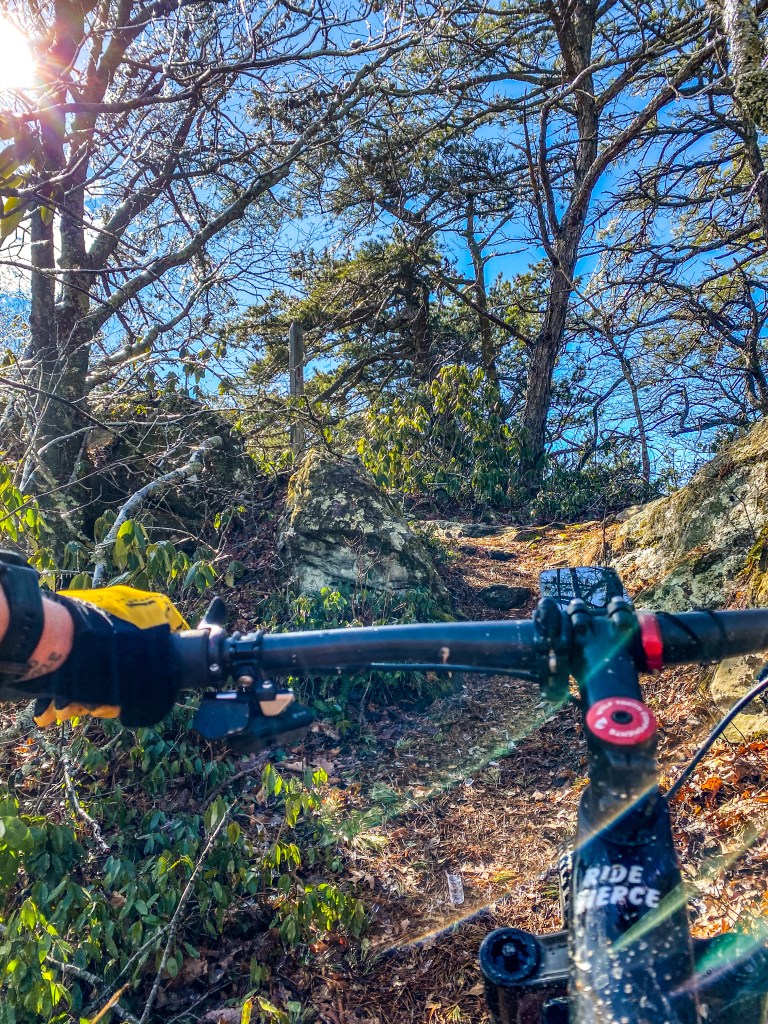 When I got to the ridgeline, I was shocked and fascinated to realize that it was an icy winter wonderland, so the ridge riding was more of a experiment in avoiding falling ice chunks and navigating through foliage heavy with ice, but eventually, stops and starts later, I reached the descent, with its enthralling singletrack, swollen mountain creeks, and benchcut flow. Each little climb that followed felt like a small moment of focused breath between the breathless descents, and I finished that ride eager to return.