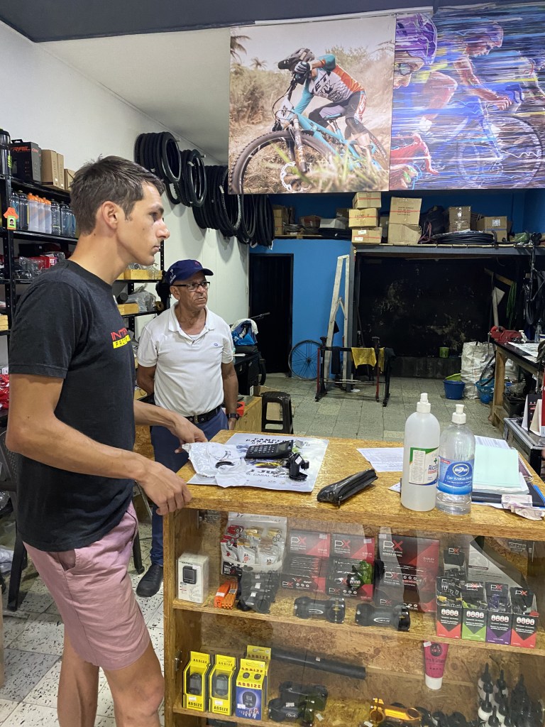 After the coffee tour, we headed into Pereira to try and find a headset for Jules’ bike. The shop we decided to try first was a Scott dealer, and with the help of Google Translate, the broken headset parts, and general miming, we learned that despite having several nice Scott mountain bikes in stock, they had only headset, which Carson determined would most likely work–at least for the duration of the race. With headset bearings in hand, we returned to the Airbnb, where Carson began working on the bike and Jules and I headed off to the technical meeting for the race.