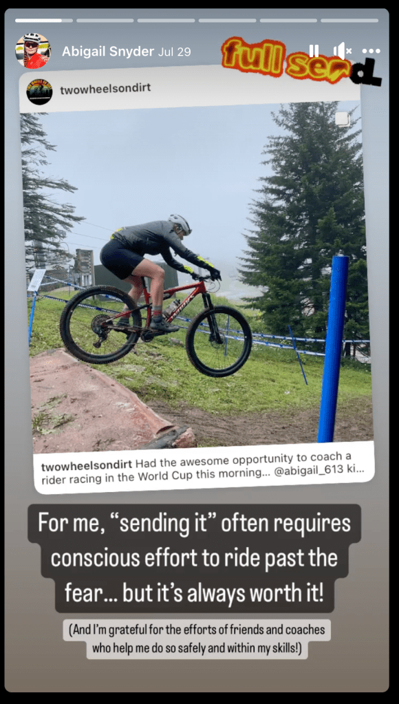 It’s worth a shout-out to the other RSC DH coaches who were there (Matt, Dan, Brian) for being incredibly understanding and kind. In that moment, hyperventilating, crying, and completely frozen with terror, they didn’t shame me or even try to coax me into riding that feature. Instead, they encouraged me to take the rest of the trail at my own pace–which I did. Though I was still shaky by time we worked our way down the rest of the trail, I rode the remaining features on the trail, and continued riding the rest of the day.