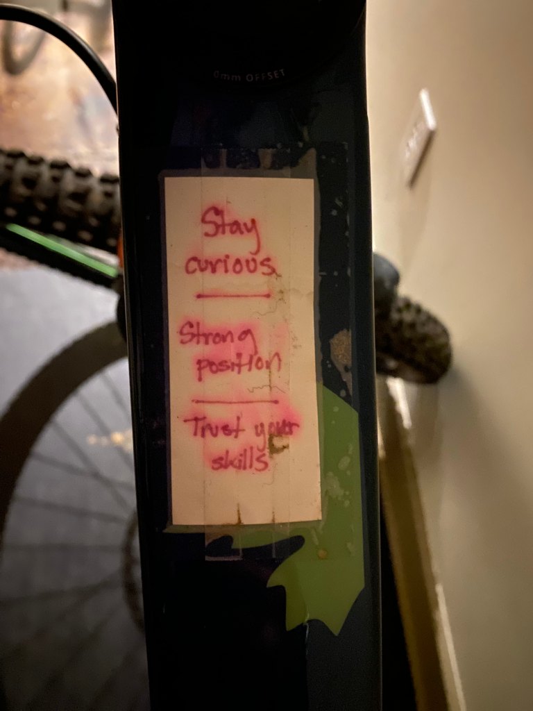 On my top tube, I wrote three things: Stay Curious, Trust Your Skills, Strong Position. In addition to these visual cues, I determined that I wanted to focus primarily on building confidence through this race, not on results. To do that, I gave myself “permission” to take things slow, walk features if I didn’t feel comfortable with them, and to just have fun. Part of that included choosing a different “crew” to ride with than I historically would have; instead of the “fast racer bois,” I opted ahead of time to ride with a local friend and coach for the junior gravity team, and a few other guys who held a more “chill” approach to enduro racing (they are still very fast–just not as results-oriented).
