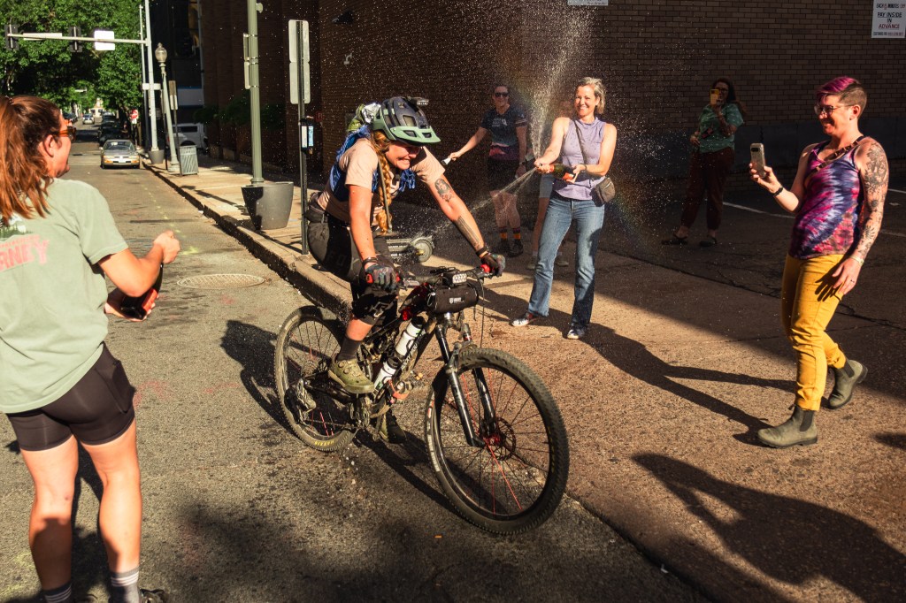 Then, as I got closer, a coworker at Cardinal rolled up on his mountain bike to follow me in, then others came out along the course to give me fist bumps and cheer me on. I also occasionally got glimpses of notifications on my watch from the Riveter’s MTB group chat, where the ladies were dot-watching and planning to meet me at the Star. I was pretty broken by this point, struggling to put any weight at all on my left leg, and mentally rehearsing the miles and trails to get me to the finish, but it was cool to see friends along the way.