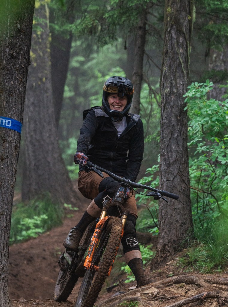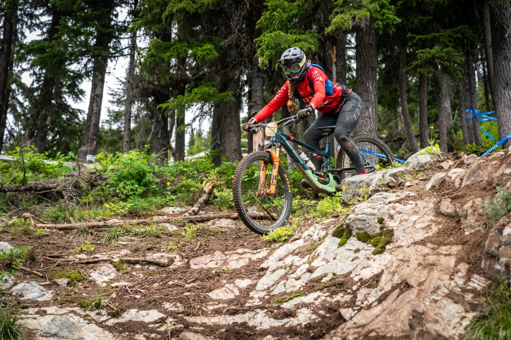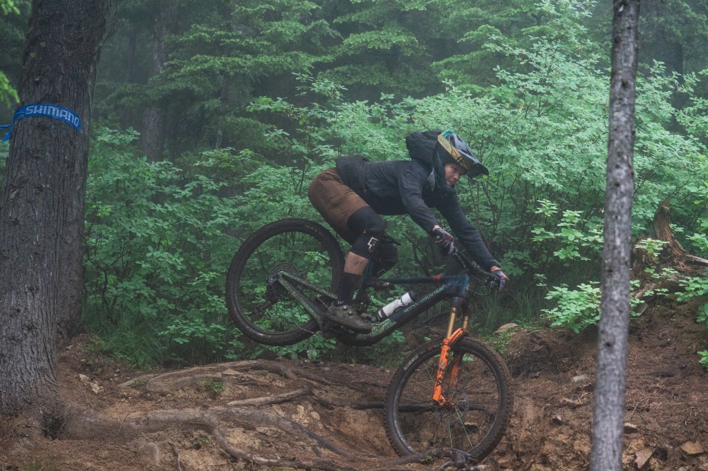 Stage 5: There is another long, chunky climb heading to Stage 5, and I felt better on this transfer during the race than I had on pre-ride (its amazing what fueling the body can do!). After riding on dry roots all day, I took a wet root slide right into a tree towards the top of the stage, then dabbed a bit through the chunky scree field towards the bottom, but otherwise felt relatively smooth (as smooth as possible while grabbing brakes through a downhill boulder garden?).
