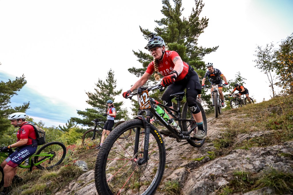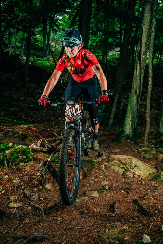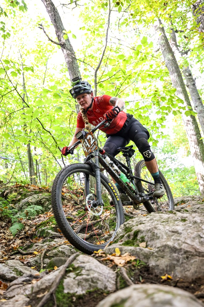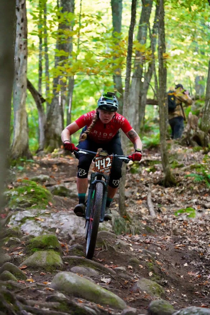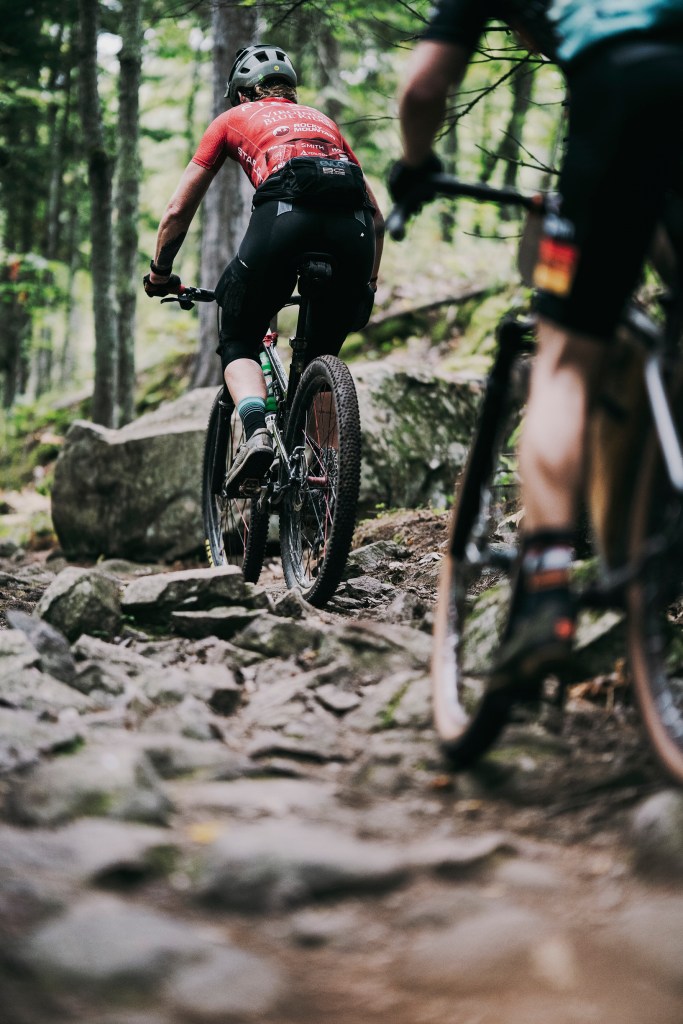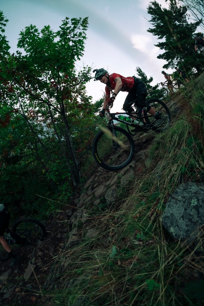 One of the sections of trail that I did remember from my pre-ride with Ben in June was the “top of the world” slab, and as I approached it, I was in a group of guys that split as they approached the climb up to the slab. I saw people walking on the left, and chose the right line which zig-zagged up, but was able to keep riding, looking for the line as I reached the top. All I remembered is that it was rideable if you went straight down (even if intimidating from the top), so I followed the sound of the hecklers, weaved around people slowed and walking their bikes, and pointed my bike down the slab–only to find more riders walking down the main line. I rarely yell in a mtb race, but my request of “Rider back,” escalated to a yell of “Riding this–MOVE!” as I attempted to hold a near-track stand while rolling the slab in order to not have to dismount–or take out the riders who were walking their bikes in front of me. Apologies to whoever it was I yelled at…and thanks for scrambling out of the way to let me by.