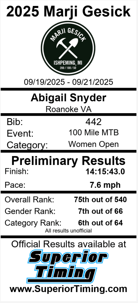 This spring, as I was determining my race schedule for the season, a friend from Marquette reached out and said that I should race Marji–and that I should try for the buckle. In Marji’s long history, no woman (spoiler: until this year) has ever broken the 12-hour mark to claim a belt buckle. Ben thought I might have a shot at it. I was hesitant, as, at the time, I’d never even ridden 100 miles on a mountain bike, and wasn’t sure a race of that distance was even within my capabilities.